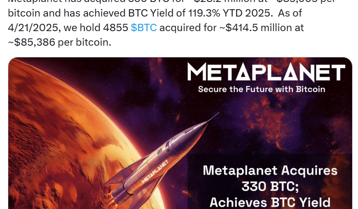 Metaplanet acquired 330 Bitcoin (BTC) for $28.2 million at an average price of $85,605 per BTC, bringing its total holdings to 4,855 Bitcoin worth $414 million, according to an April 21 post from Simon Gerovich, the CEO of Metaplanet.