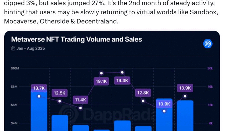Metaverse-related non-fungible token sales rose 27% in August from the month prior, suggesting people could be “slowly sneaking back into virtual worlds,” according to an analyst from DappRadar.