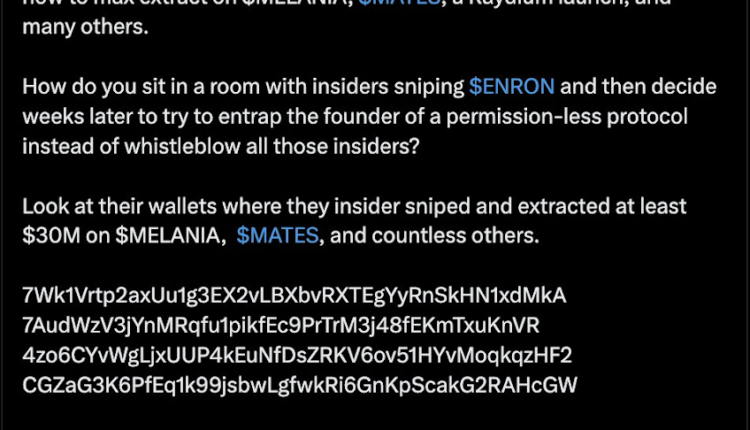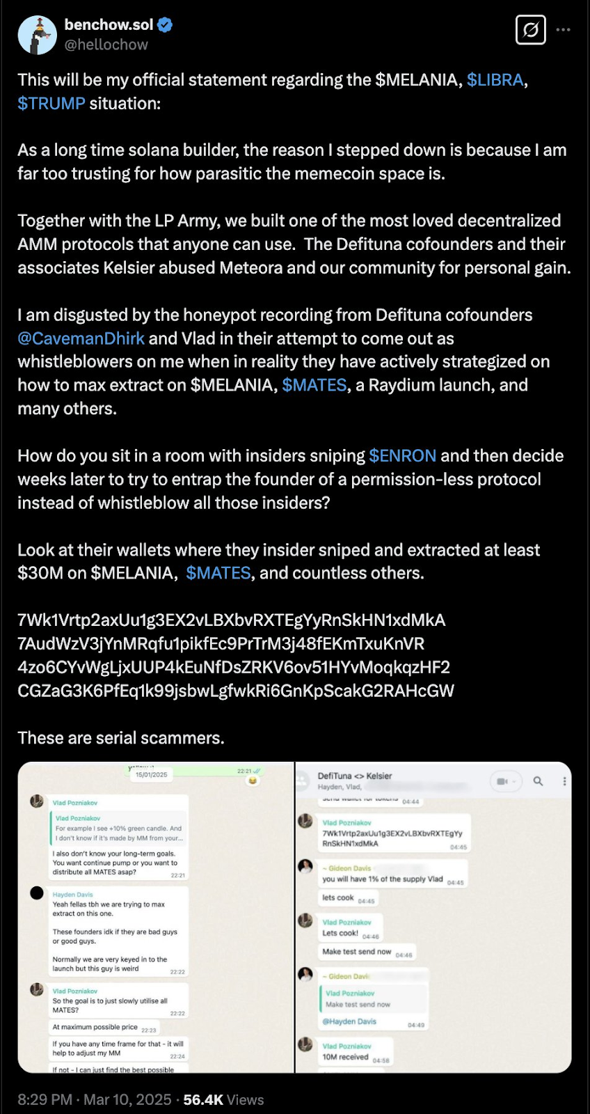 On March 11, Chow’s X account posted an “official statement” about his departure from Meteora. The post called out DefiTuna founders Vlad Pozniakov and Dhirk, claiming the duo’s sole intention was to extract the maximum funds possible from various memecoin token launches, including MELANIA, Mates (MATES) and a Raydium launch.