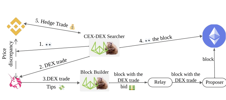 A simplified graphic mapping out a CEX-DEX arbitrage trade. Source: Measuring CEX-DEX Extracted Value and Searcher Profitability