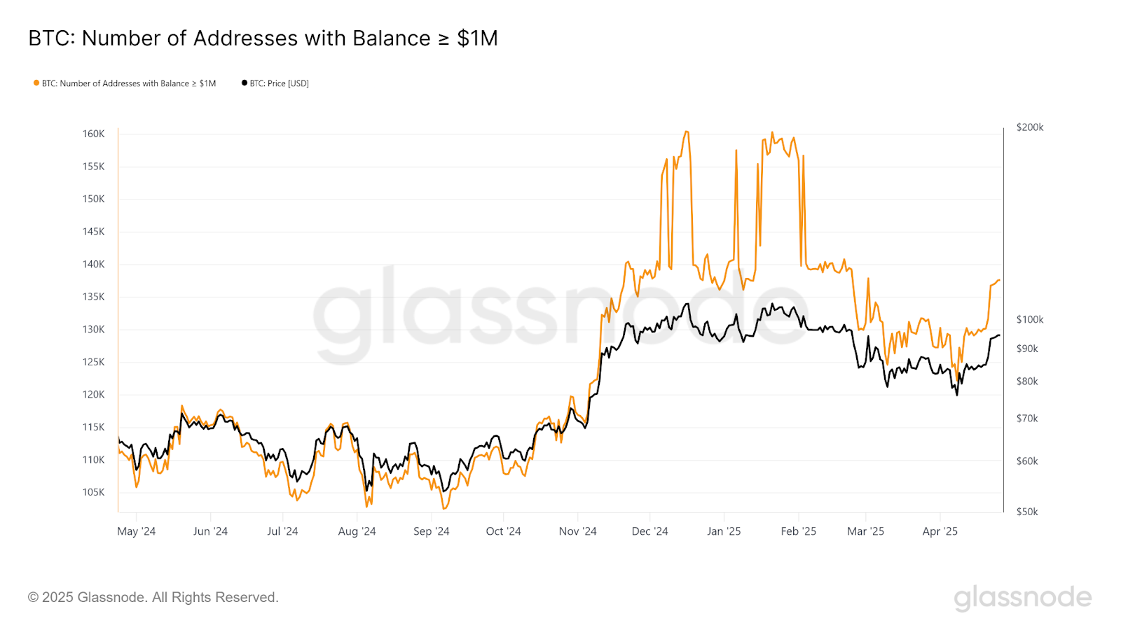 Whale wallets holding at least $1 million worth of Bitcoin restarted their accumulation at the beginning of April, increasing from 124,000 wallets on April 7 to over 137,600 wallets on April 26, Glassnode data shows.
