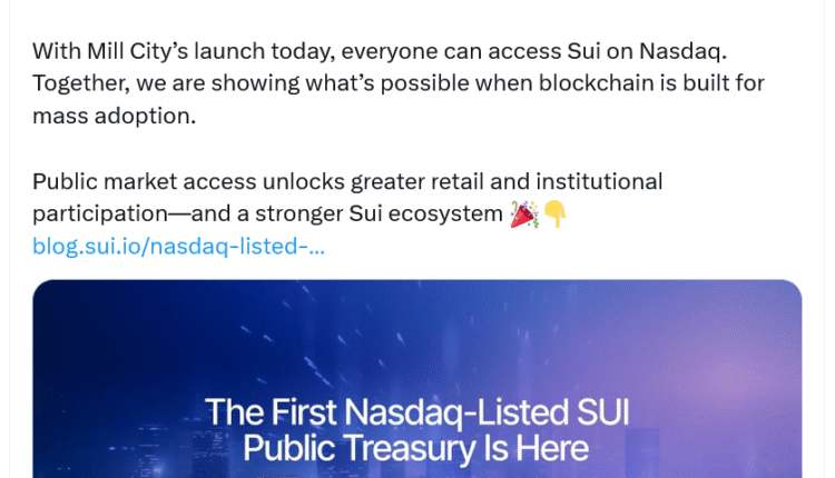Mill City’s announcement on Friday comes shortly after raising $450 million earlier in the week. The financial services firm then became the first official public company to build a Sui (SUI) treasury when it purchased 76.2 million SUI tokens valued at $276 million.
