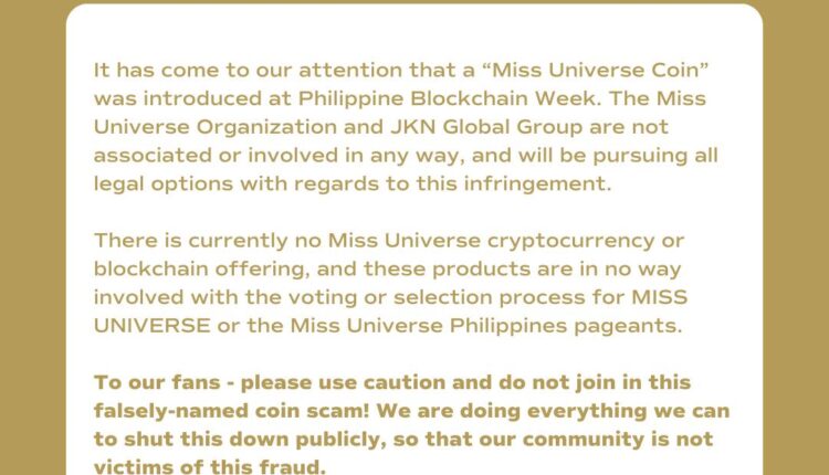 “There is currently no Miss Universe cryptocurrency or blockchain offering, and these products are in no way involved with the voting or selection process for Miss Universe or the Miss Universe Philippines pageants,” they wrote.