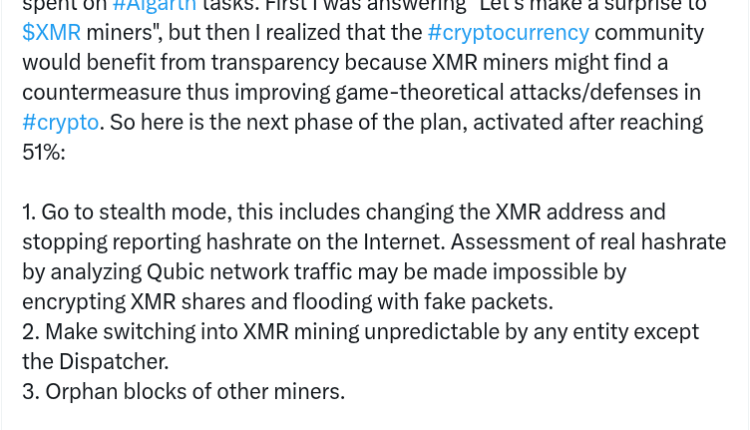 In a Monday X post, Ivancheglo said that from next Wednesday, the Qubic mining pool will stop reporting its hashrate — a measure previously expected to be implemented after the pool took control of most of the hashrate. This would make it much harder to determine how much of Monero’s hashrate is controlled by Qubic and assess the danger it posed to the network.