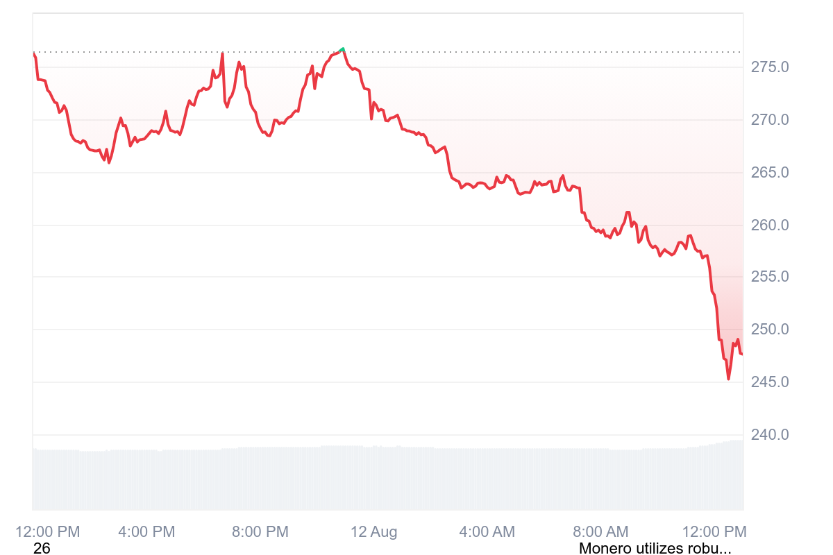 As of the time of writing, Monero’s price stands at over $247, down over 8.6% from the price of over $276 reported 24 hours ago.