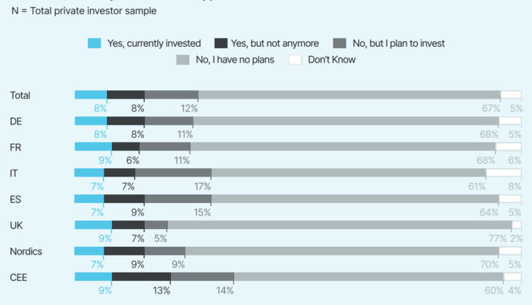 The study surveyed 10,000 retail and business investors across 13 European countries and found that more than 40% of business investors already hold cryptocurrencies, with another 18% planning to invest in the near future.