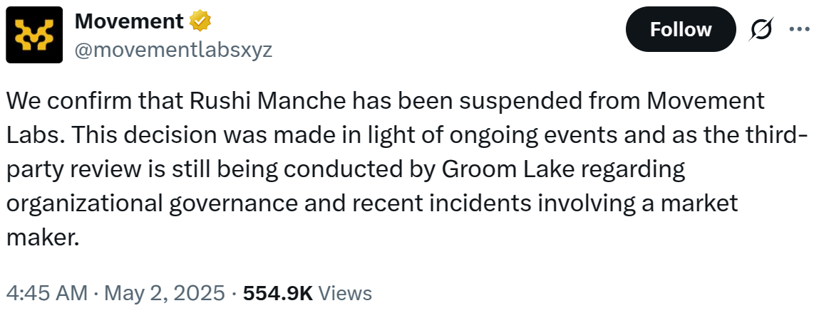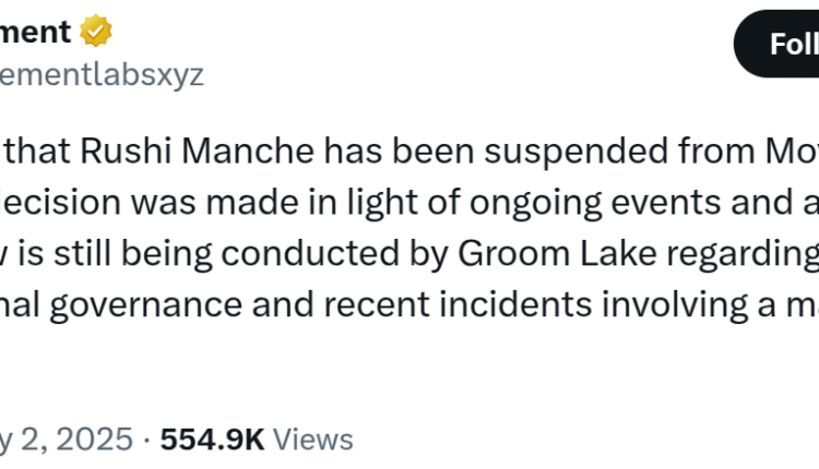 Movement Labs confirmed the suspension of its co-founder, Rushi Manche, following controversies over a market maker deal that he brokered.