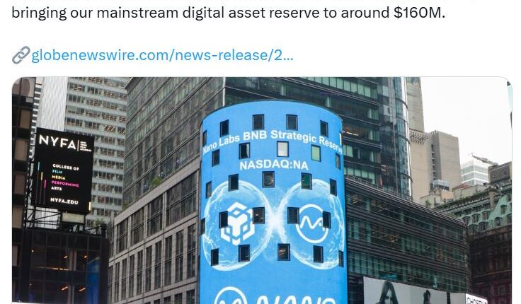 Nano Labs reiterated on Thursday that its long-term goal is to purchase up to $1 billion worth of BNB (BNB) and hold between 5% and 10% of the total circulating supply.