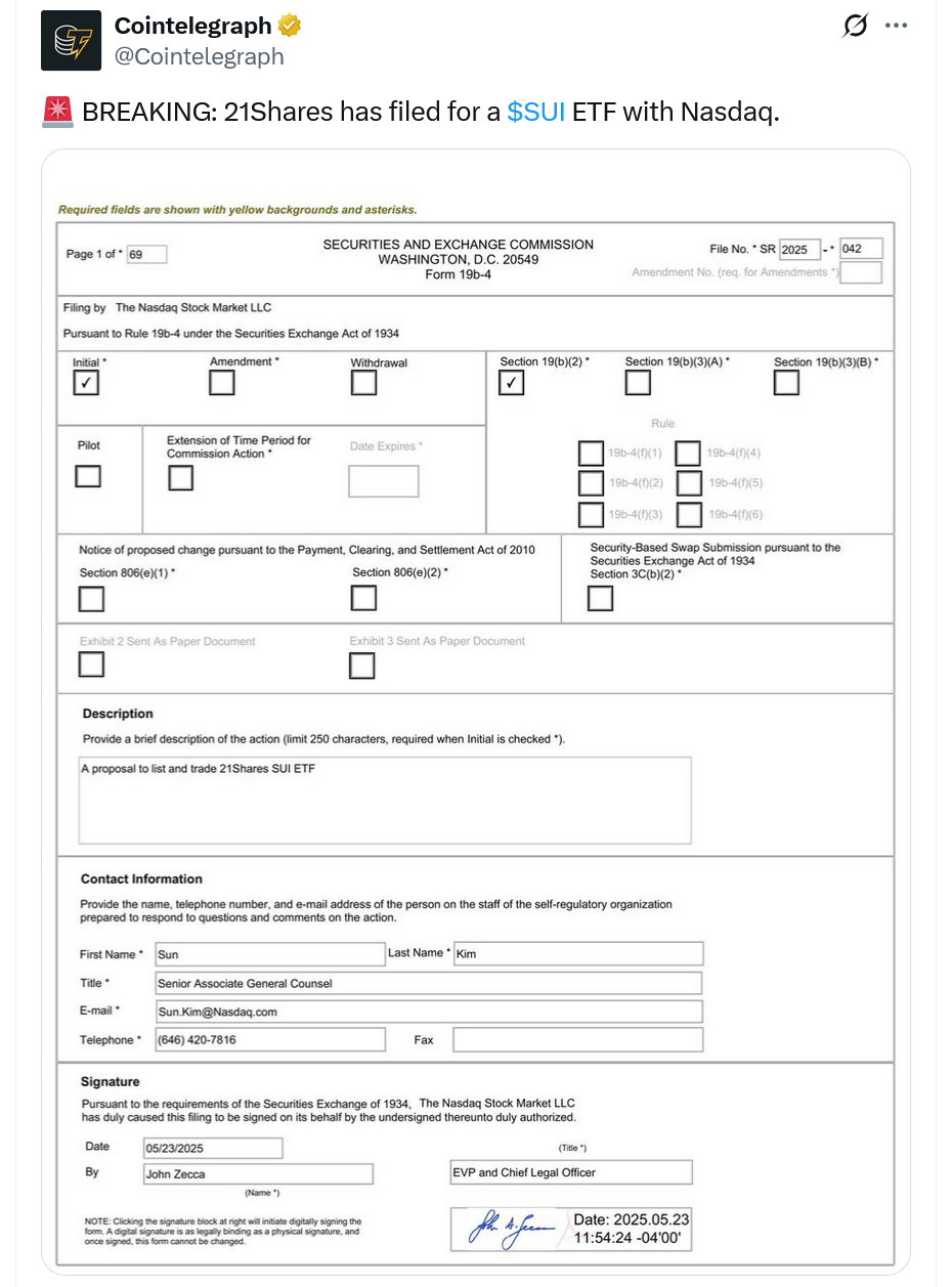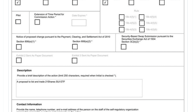 The stock market’s May 23 19b-4 filing, which asks the SEC to list the 21Shares SUI ETF, follows 21Shares’ April 30 submission of its S-1 registration statement to the SEC, which asked the regulator to approve trading of the proposed fund.