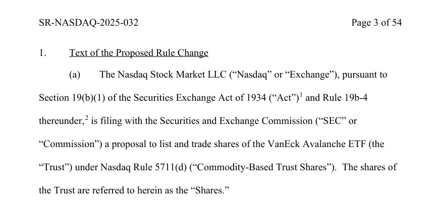 The filing, signed by Nasdaq’s executive vice president and chief legal officer John Zecca, requests approval to list and trade shares of the VanEck Avalanche ETF under the company’s Rule 5711(d), which governs the trading of commodity-based trust shares.
