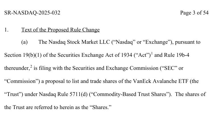 The filing, signed by Nasdaq’s executive vice president and chief legal officer John Zecca, requests approval to list and trade shares of the VanEck Avalanche ETF under the company’s Rule 5711(d), which governs the trading of commodity-based trust shares.