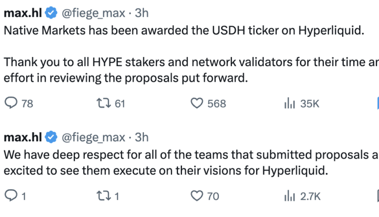Native Markets, one of the teams that submitted a proposal to issue and manage the Hyperliquid crypto exchange’s US dollar stablecoin (USDH), officially claimed the USDH ticker on Sunday, following a community vote.