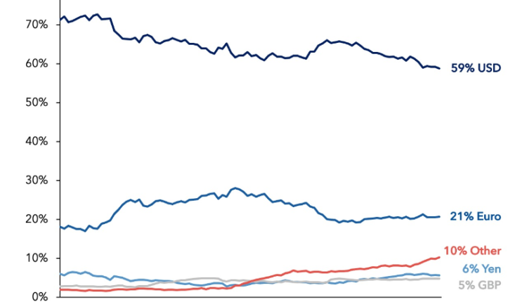 According to data from the International Monetary Fund, the U.S. dollar now accounts for just over 58% of global foreign exchange reserves, a considerable decrease from the 71% share it had in 2001.