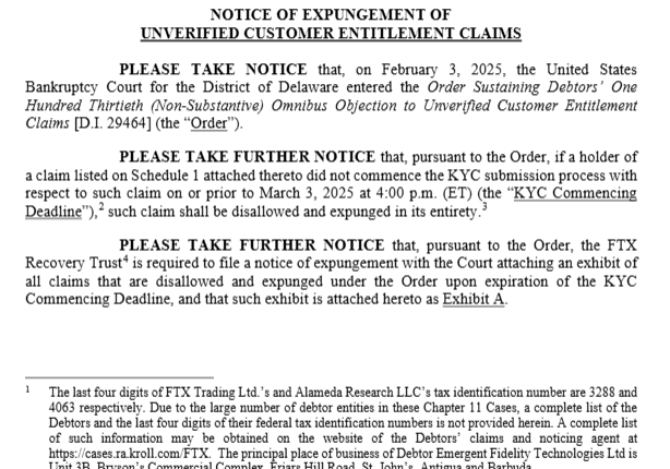 “If a holder of a claim listed on Schedule 1 attached thereto did not commence the KYC submission process with respect to such claim on or prior to March 3, 2025, at 4:00 pm (ET) (the “KYC Commencing Deadline”), 2 such claim shall be disallowed and expunged in its entirety,” the filing states.