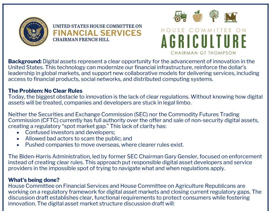 The discussion draft, led by the House agricultural and financial services committee chairs Glenn Thompson and French Hill, is an “incremental, albeit meaningful, rewrite” of the Financial Innovation and Technology for the 21st Century Act (FIT21), Paradigm’s vice president of regulatory affairs Justin Slaughter said in a May 5 X post.