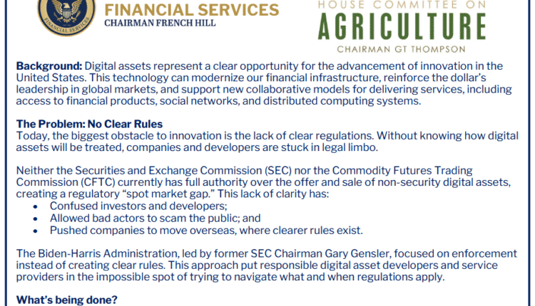 The discussion draft, led by the House agricultural and financial services committee chairs Glenn Thompson and French Hill, is an “incremental, albeit meaningful, rewrite” of the Financial Innovation and Technology for the 21st Century Act (FIT21), Paradigm’s vice president of regulatory affairs Justin Slaughter said in a May 5 X post.
