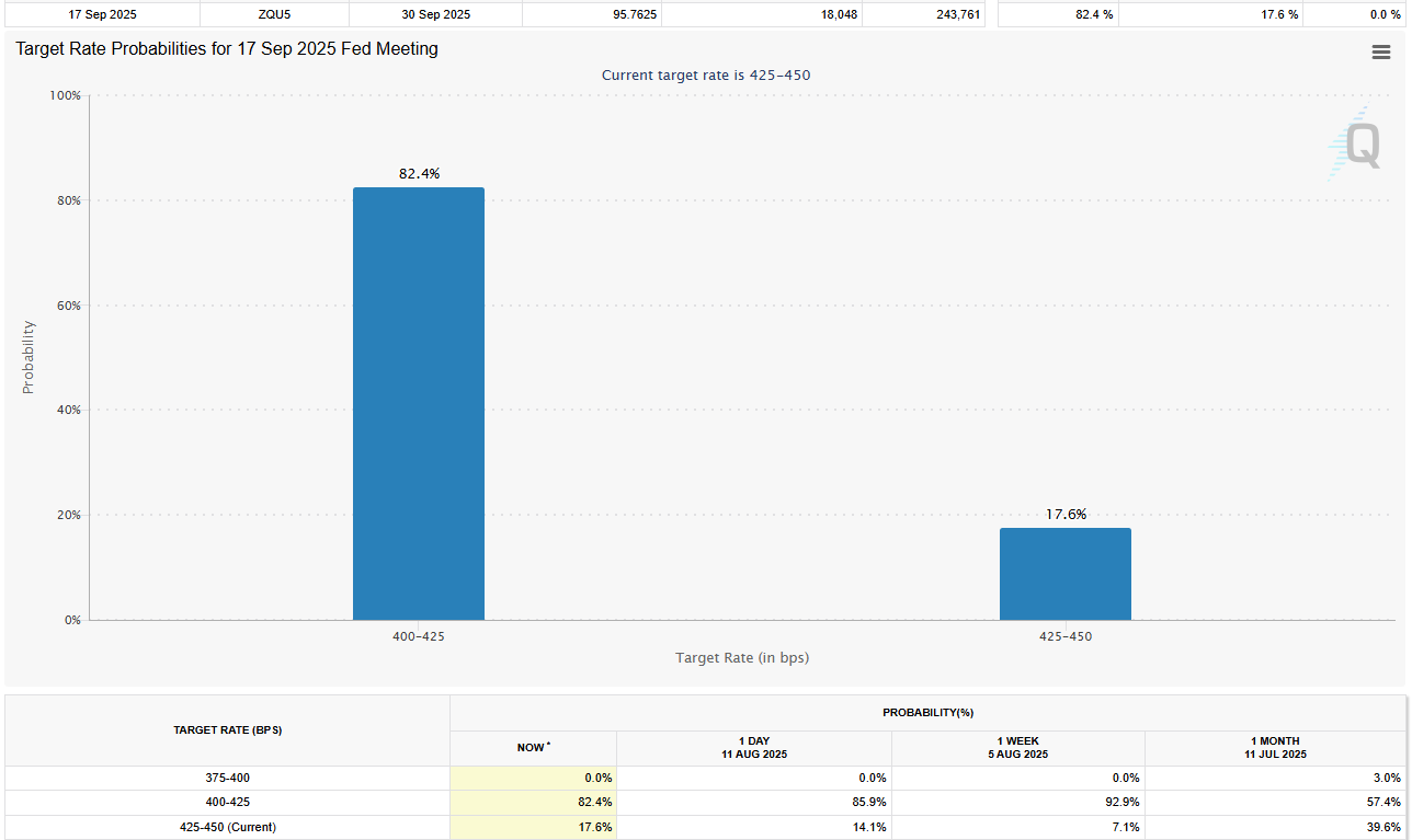 Markets are pricing in an 82% chance that the Fed will keep interest rates steady during the next Federal Open Market Committee meeting on Sept. 17, according to the latest estimates of the CME Group’s FedWatch tool.