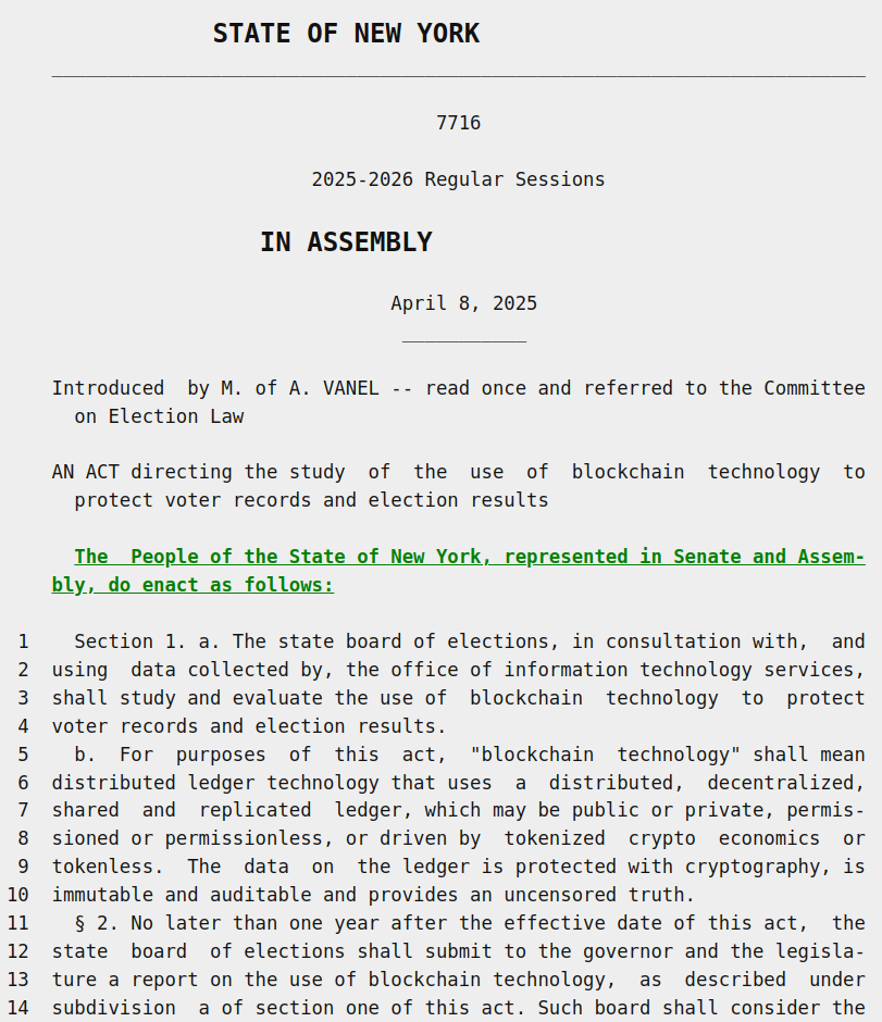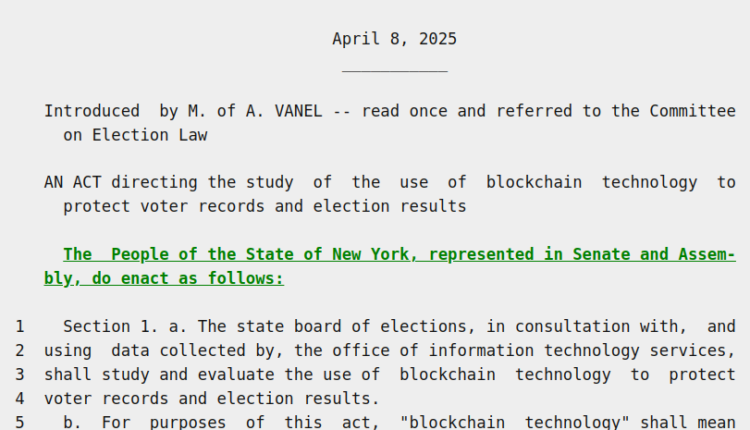 New York Assemblymember Clyde Vanel introduced Bill A07716 on April 8, directing the state Board of Elections to evaluate how blockchain could help protect voter records and election results. The legislation is currently under consideration by the Assembly Election Law Committee.