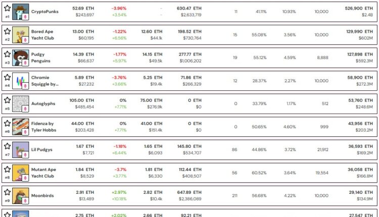 Apart from the three collections, other top 10 NFT collections by market cap include Art Block’s Chromie Squiggle by Snowfro, Autoglyphs, Fidenza by Tyler Hobbs, Lil Pudgys, Mutant Ape Yacht Club (MAYC), Moonbirds and Milady Maker.