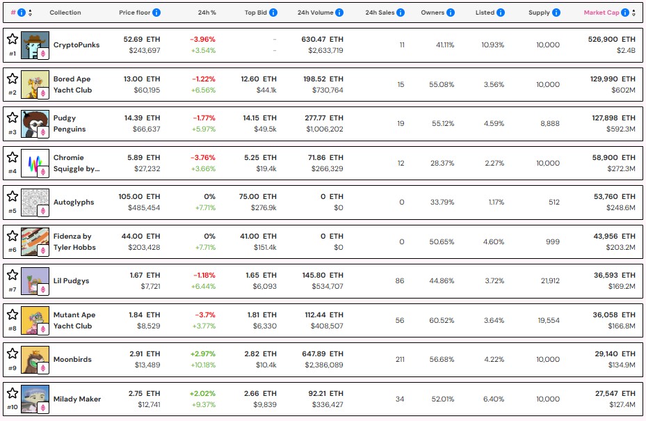 CryptoPunks retains its spot as the top NFT collection by market capitalization. NFT Price Floor data shows that the collection is worth at least 526,900 ETH (about $2.4 billion).