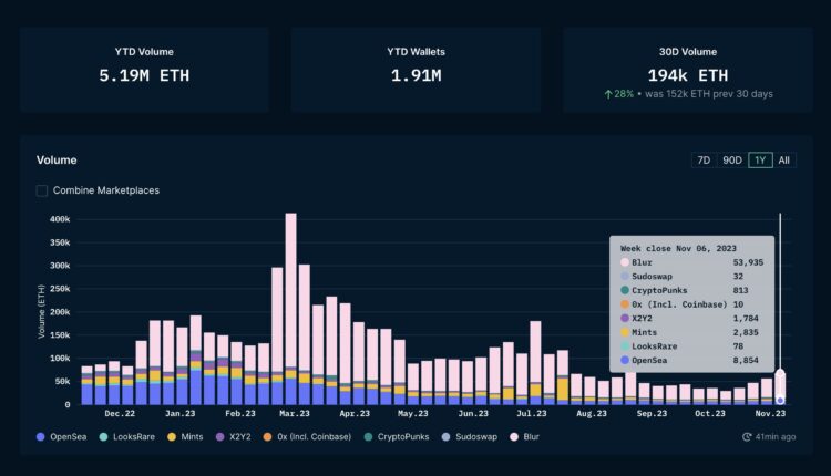 In the weeks leading up to November, nonfungible token (NFT) data showed a consistent upward leap in weekly sales. While the volume is still far from its peak in 2021, executives in the industry believe the upward trend will likely continue.