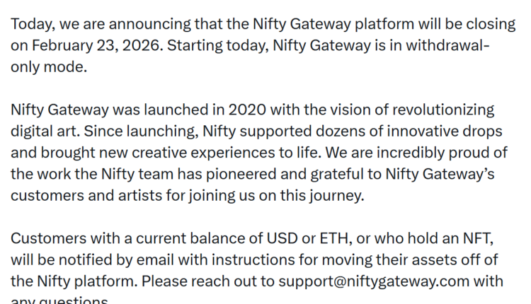 “Today, we are announcing that the Nifty Gateway platform will be closing on February 23, 2026,” the Gemini-owned platform wrote in a Saturday post on X, adding that it has already entered withdrawal-only mode, giving users roughly one month to move any remaining NFTs or funds off the site.