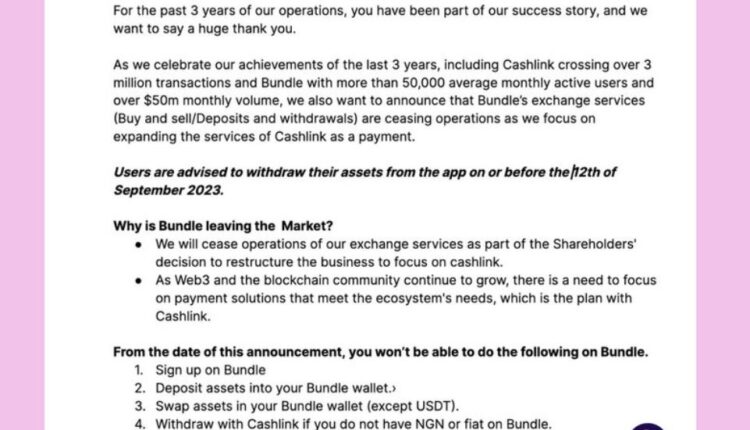In the statement, the company cited that this decision by its shareholders is a result of the observed growth of the Web3 and blockchain community and hence the need to focus on payment solutions that meet the ecosystem’s needs. In the company’s press release, it confirmed that users won’t be able to sign up on Bundle, deposit assets into their Bundle wallet, swap assets in their Bundle wallet (except USDT) or withdraw with Cashlink if they do not have NGN or fiat on Bundle.