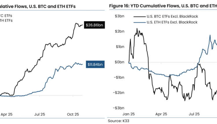 BlackRock’s iShares Bitcoin Trust ETF accounted for over $28.1 billion of the total $26.9 billion inflows to US spot Bitcoin ETFs in 2025 so far.