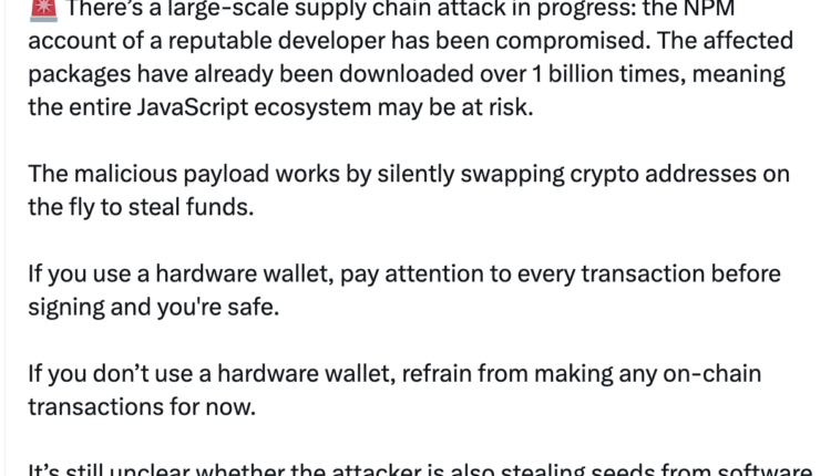 Hackers have compromised widely used JavaScript software libraries in what’s being called the largest supply chain attack in history. The injected malware is reportedly designed to steal crypto by swapping wallet addresses and intercepting transactions.