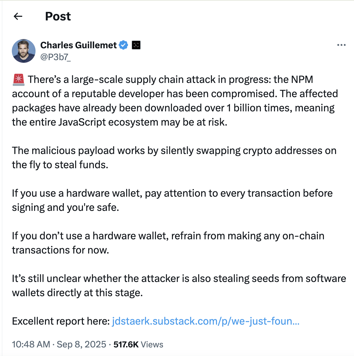 Attackers appear to have planted a crypto-clipper, a type of malware that silently replaces wallet addresses during transactions to divert funds. Security researchers warned that users relying on software wallets may be especially vulnerable, while those confirming every transaction on a hardware wallet are protected.