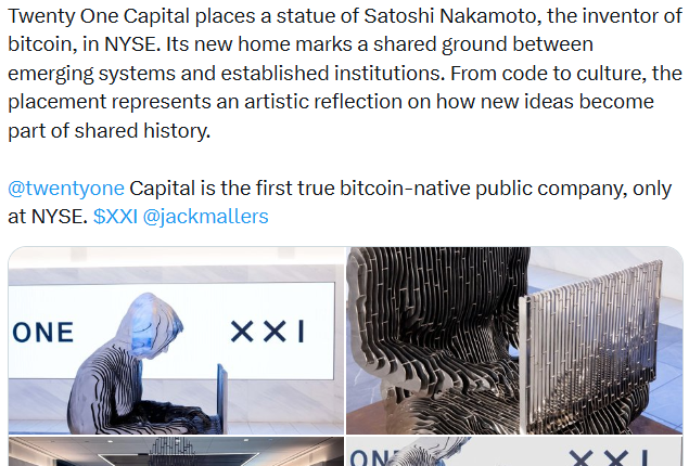 The NYSE is considered a center of traditional financial institutions, and the inclusion of a Nakamoto statue marks it as “shared ground between emerging systems and established institutions,” the stock exchange said in an X post on Wednesday.