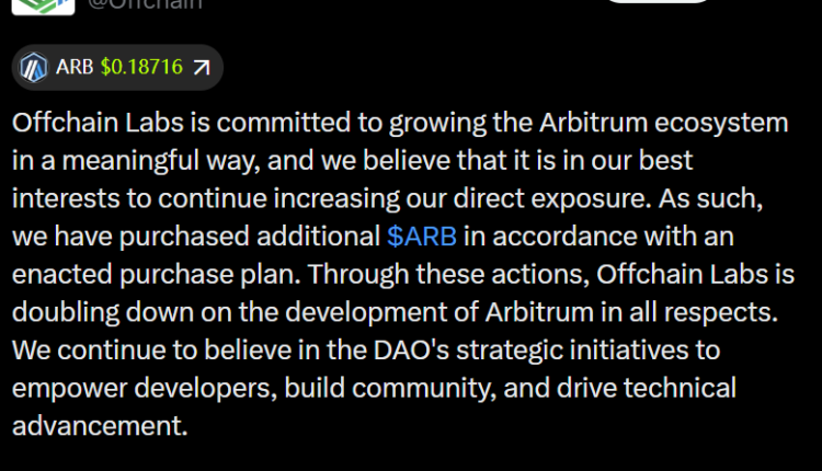 In a post on X this week, Offchain Labs said it remains “committed to growing the Arbitrum ecosystem in a meaningful way,” adding that it has increased its direct exposure to Arbitrum (ARB) under an approved purchase plan.