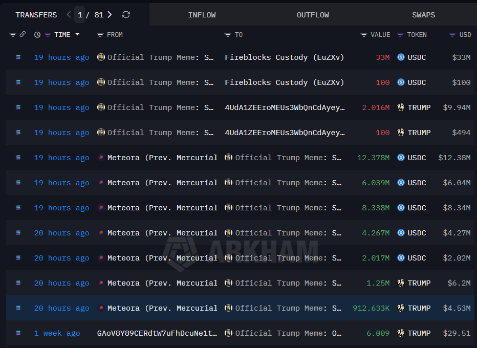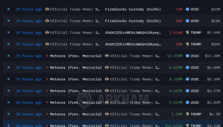 Onchain analysts tracking the Official Trump (TRUMP) memecoin on Solana have flagged large transfers from wallets labeled as part of the “Official Trump Meme” cluster that moved roughly 94 million USDC from TRUMP liquidity pools over the past month.