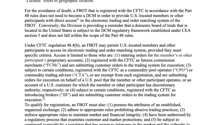 The CFTC’s guidance also stipulated that only Licensed Futures Commission (FCM) exchanges, which are broker-dealers for futures contracts, and other highly regulated entities, are qualified to apply under the FBOT framework, Cohen said. He added:
