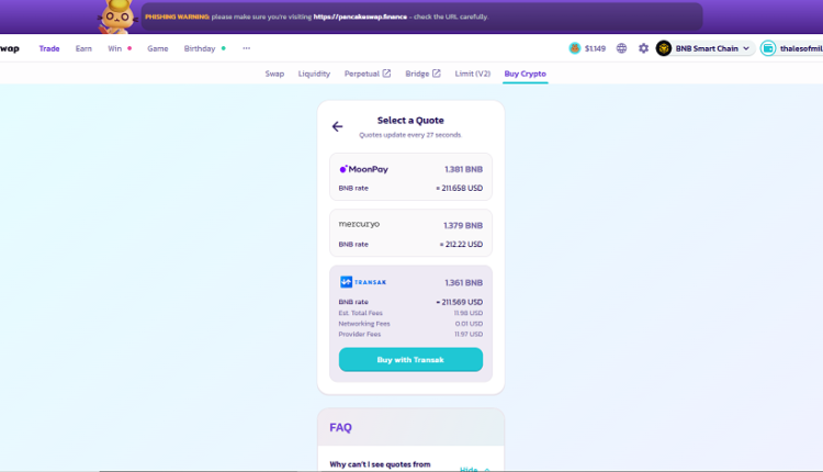 As with all DEXs, Pancakeswap can’t perform fiat to crypto conversions on its own. Users have to first own cryptocurrency in a wallet before they can use the exchange. Its development team recently implemented the “buy crypto” feature in an attempt to fix this problem by allowing users to onboard with third-party providers like Mercuryo, Moonpay and now Transak. Transak claims to be integrated into over 350 Web3 apps, making it one of the most accessible crypto onboarding services.