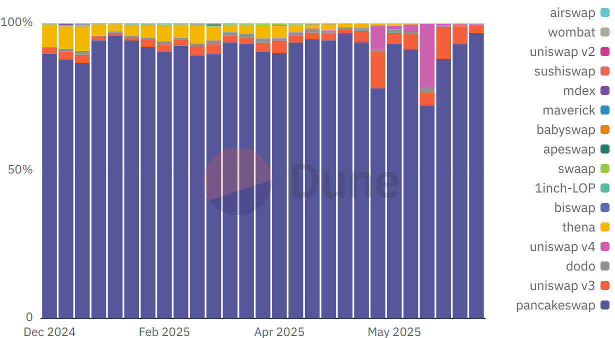 However, this growth is still largely concentrated on a single chain. PancakeSwap currently supports only nine chains, far fewer than Uniswap’s 37. In Q2, a staggering 96.7% of PancakeSwap’s total trading volume came from BNB Chain, where volume reached $513 billion. Its market share on BNB Chain in June alone was 96.8%.