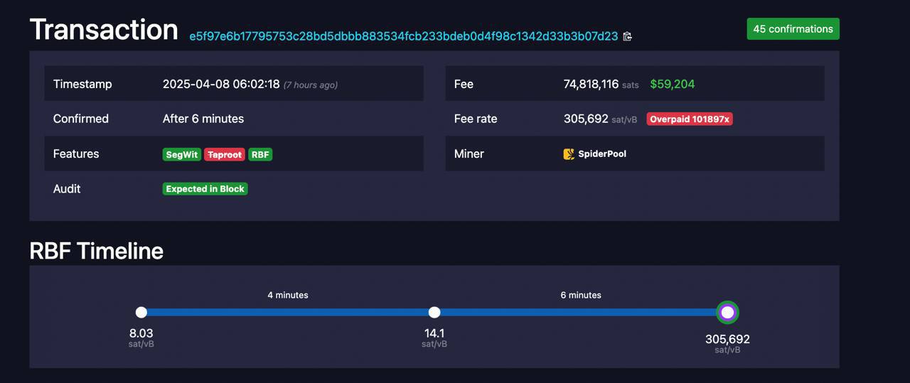 The second RBF transaction also added an additional input unspent transaction output (UTXO). This UTXO contained nearly 0.75 Bitcoin (BTC). The change was mistakenly included as part of the fee, likely because the user failed to update the change address or misjudged the transaction’s structure.
