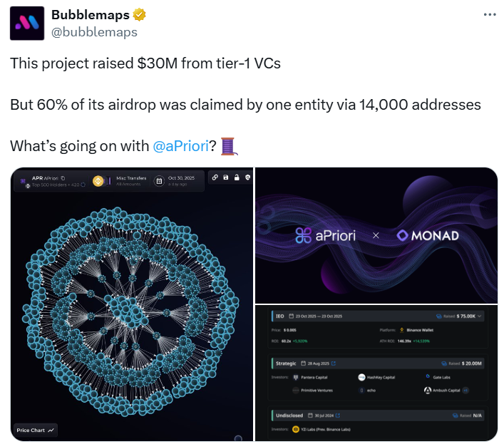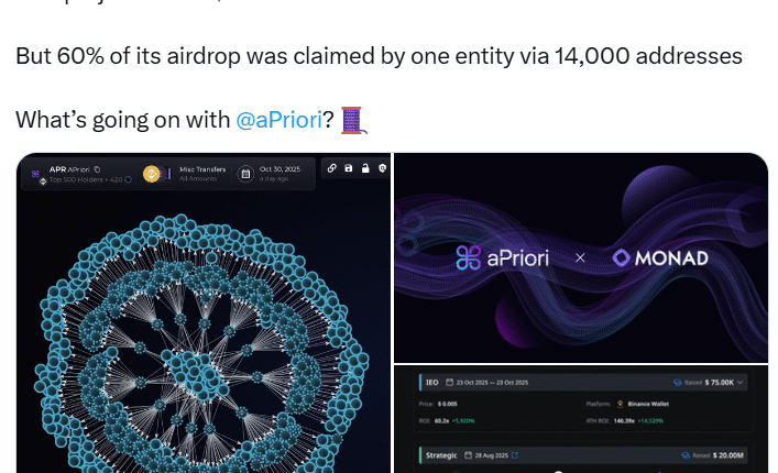 Web3 startup aPriori has gone quiet after fresh allegations over its latest token airdrop, as onchain analysts flag unusually concentrated distribution patterns.