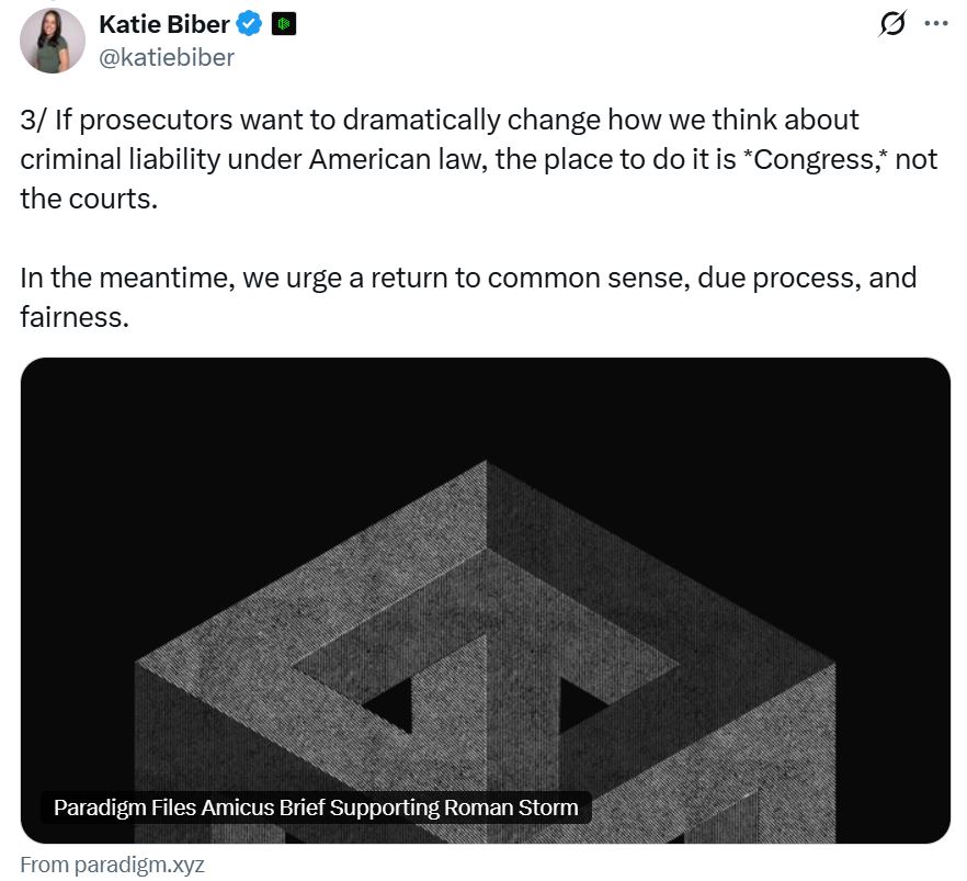Katie Biber, Paradigm’s chief legal officer, and Gina Moon, the firm’s general counsel, said in a blog post on Tuesday that the prosecution’s argument is “contrary to the plain text of the law, clear FinCEN guidance, and decades of case law.”