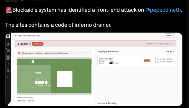“Blockaid’s system has identified a front-end attack on Pepe. The site contains a code of inferno drainer,” the cybersecurity company said on Thursday.