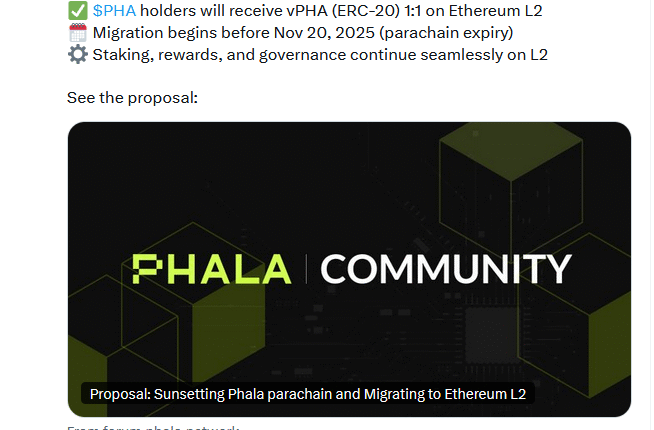 The post adds that Phala (PHA) tokenholders will receive the new ERC-20 variant at a 1:1 ratio, the “migration” will start before Nov. 20, and that “staking, rewards, and governance” will continue seamlessly on the new layer 2 (L2).