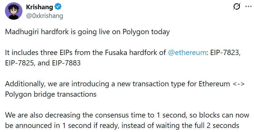 Polygon core developer Krishang Shah said on X that the update includes support for three Fusaka Ethereum Improvement Proposals, specifically EIP-7823, EIP-7825 and EIP-7883. These EIPs make heavy mathematical operations more efficient and secure by limiting the amount of gas they consume.
