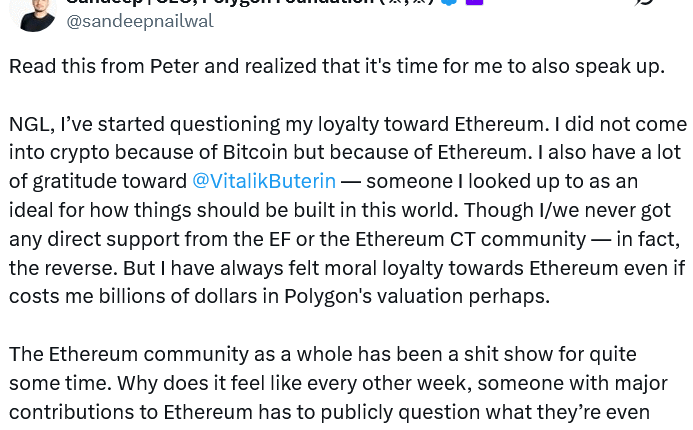 Nailwal, who also serves as the Polygon Foundation’s CEO, said he is now “questioning his loyalty” to Ethereum — particularly the Ethereum Foundation and the community, which, according to him, hasn’t given Polygon any direct support.