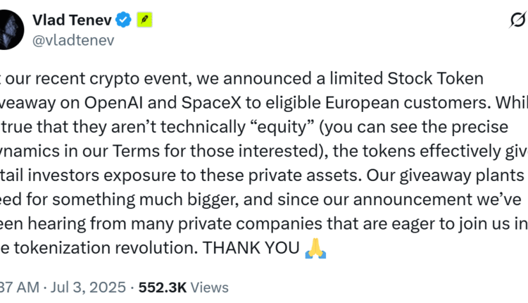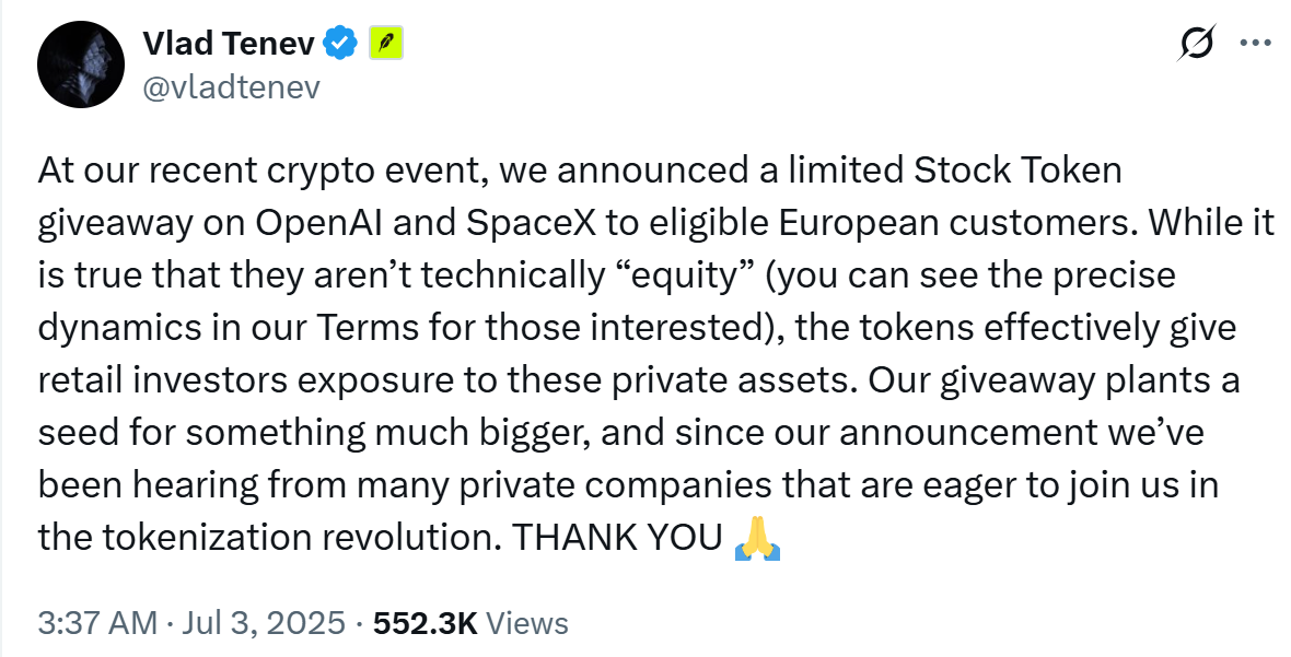 Currently only available in the EU, the platform offers over 200 tokenized US equities tradable five days a week. It also included a promotional giveaway of non-tradable tokens representing private companies like OpenAI and SpaceX.