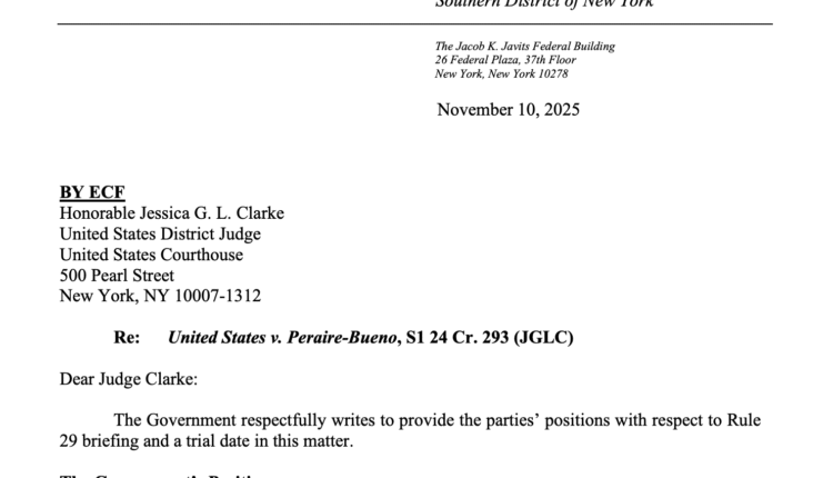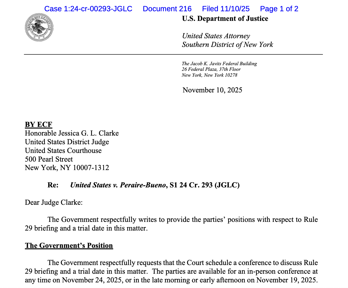In a Monday filing in the US District Court for the Southern District of New York, lawyers representing the US government requested a federal judge schedule a retrial for the Peraire-Bueno brothers “as soon as practicable in late February or early March 2026.”