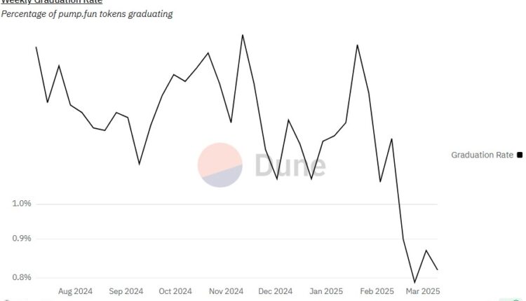 Over the past four weeks, starting from Feb. 17, Pump.fun’s graduation rate has remained below 1% for the first time, Dune Analytics data shows.