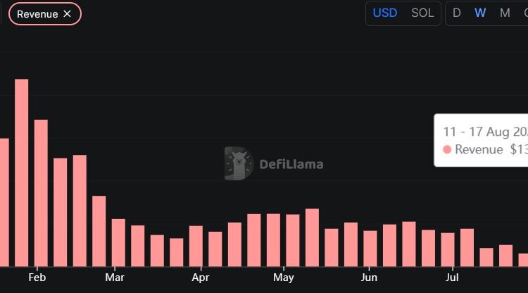 The increase came after a sharp revenue drop from July 28 to Aug. 3. During that time, Pump.fun brought in only $1.72 million in weekly revenue, its lowest since March 2024. This contributed to the platform’s revenue drop in July, its lowest monthly revenue this year.