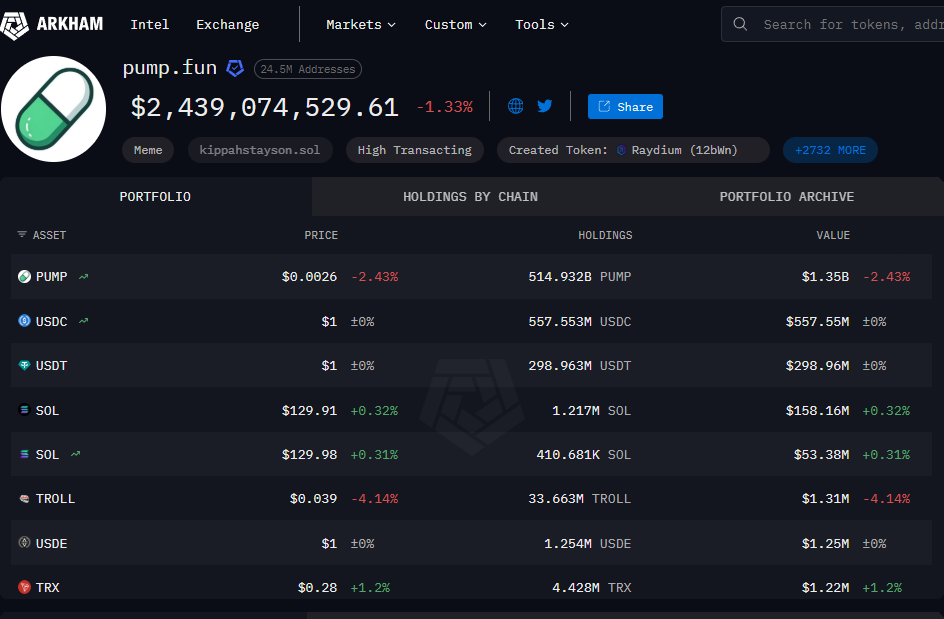 The Pump.fun-tagged cryptocurrency wallet still holds about $855 million worth of stablecoins and $211 million worth of Solana (SOL) tokens, according to blockchain data platform Arkham.