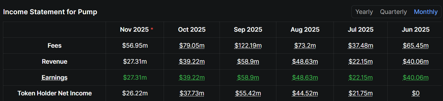 Pump.fun’s monthly revenue fell below $40 million for the first time since July, dropping to $27.3 million in November, down 53% from September’s $58.9 million, according to data from DefiLlama.