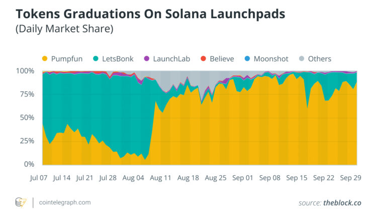 Throughout 2025, external trackers consistently showed Pump.fun holding around a 75%-80% share of “graduated” Solana launchpad tokens during market upswings — a level it returned to in August after the July dip.